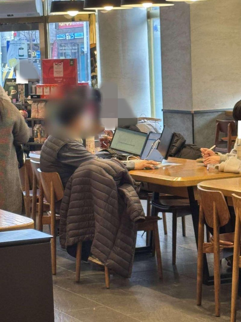 그곳에서 자신의 옆 의자엔 외투를 걸어놨고 테이블 위에는 노트북에 확장형 디스플레이 2대를 연결해 테이블 위 상당한 공간을 차지하고 있다. 모니터 옆과 뒤에도 개인 물품을 늘어놓고 있어 맞은편에 다른 사람이 앉을 만한 공간이 없다.