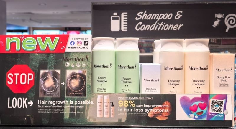 싱가포르 왓슨스 매장에서는 모어댄에잇의 Thickening(탈모 케어)라인과 Restore(데미지 케어)라인을 만나볼 수 있다. Thickening 라인은 모발 볼륨과 두피 컨디션 관리에, Restore 라인은 손상 모발 케어와 영양 공급에 초점을 맞췄으며, 두 라인 모두 비건 포뮬러와 유해 성분 배제 설계로 글로벌 클린 뷰티 기준에 부합한다.