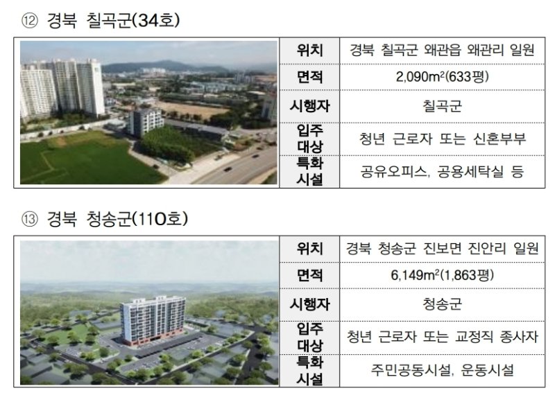 칠곡군 왜관읍 왜관리 2090㎡ 부지에는 34가구 규모 특화 주택이 조성돼 공유오피스와 공용세탁실 등 청년 근로자와 신혼부부들이 선호하는 개방형 시설을 갖춘다.
