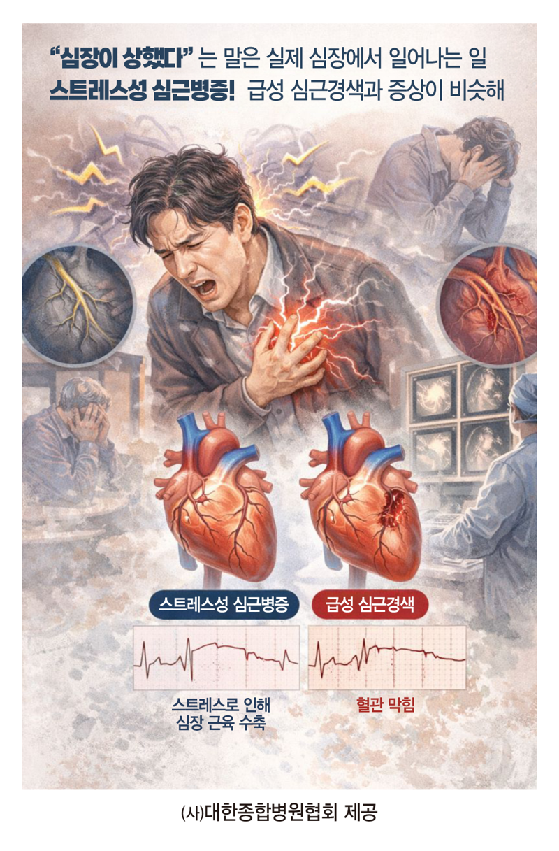 사단법인 대한종합병원협회(회장 정근·온병원그룹 원장)는 "우리가 흔히 쓰는 '심장이 상했다'는 표현은 이제 감정의 은유를 넘어 실제 심장 상태와 연결될 수 있다"면서, "갑작스러운 흉통이나 호흡곤란이 발생했다면 스스로 판단하지 말고 의료진의 진단을 통해 원인을 확인하는 것이 안전하다"고 조언한다.