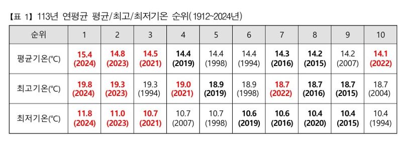연 평균 기온이 높았던 연도를 살펴보면 상위 10개 가운데 7개가 최근 10년에 집중됐다. 2024년(15.4도), 2023년(14.8도), 2021년(14.5도)이 각각 1위, 2위, 3위를 기록했다. 더운 해가 드물게 나타나는 것이 아니라 기후의 흐름 자체가 달라졌다는 분석이다.