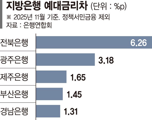 지방은행 내에서도 은행별 예대금리차 편차가 크다. 지난달 기준 전북은행이 6.26%p로 가장 컸고, 광주은행(3.18%p), 제주은행(1.65%p), 부산은행(1.45%p), 경남은행(1.31%p) 순으로 나타났다. 부산·경남은행은 지난 1년간 평균 1.67%p, 1.92%p로 시중은행과 비슷한 수준을 유지했다. 광주은행과 제주은행은 1년간 각 사 평균 2.57%p, 2.93%p로 집계됐다.