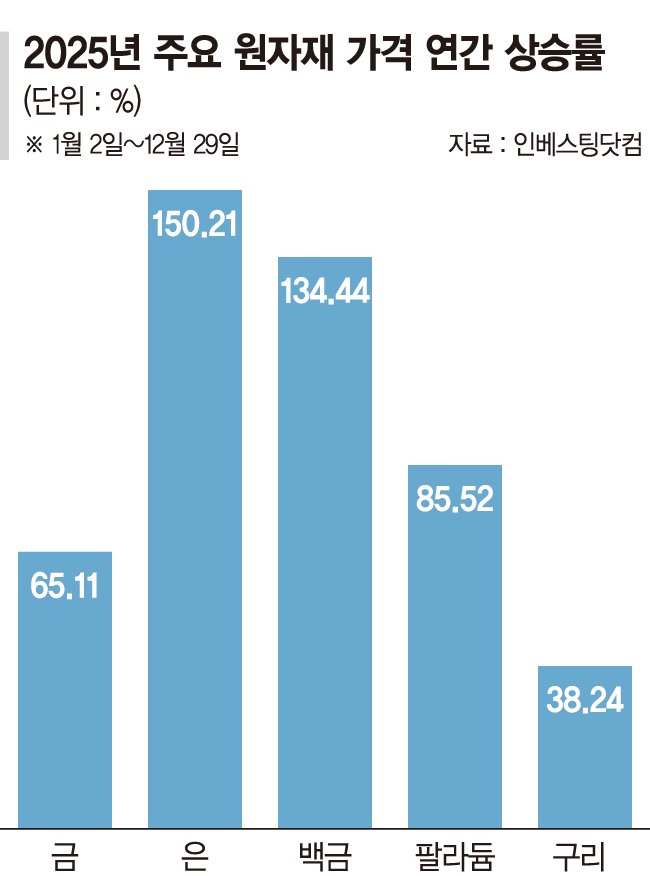 올해 국제 금, 은 가격이 각각 60%, 150% 가량 급등하며 1970년대 이후 최대 연간 상승률을 기록했다. 미국 금리 인하 기조와 지정학적 긴장 고조로 안전자산 선호 심리가 형성된 가운데 인공지능(AI) 산업 확대에 따른 전력기기 수요 증가가 귀금속 급등을 견인했다. 증권가는 내년에도 원자재 공급 부족과 금리인하 지속으로 강세가 이어질 것으로 전망했다.
