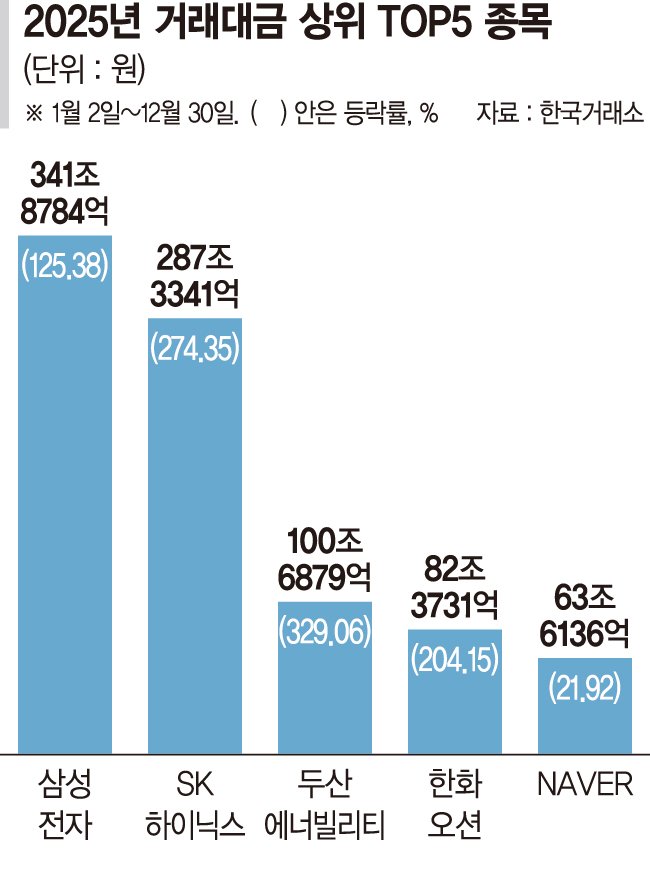 SK하이닉스가 287조3341억원으로 뒤를 이었고, 두산에너빌리티(100조6879억원), 한화오션(82조3731억원), 네이버(63조6136억원), 한화에어로스페이스(58조1362억원) 등이 거래대금 상위권에 이름을 올렸다.