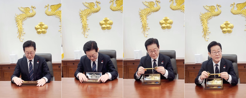 이 대통령이 집무실 책상에서 "자, 어디 한 번 '언박싱' 해볼까요"라고 말하며 트럼프 대통령 사인이 금색으로 새겨진 나무 재질 케이스를 열었다.