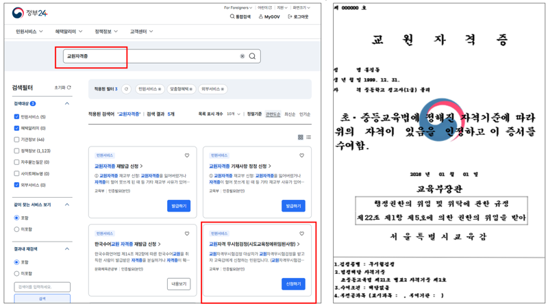 신청자는 정부24 누리집에서 직접 무시험검정 교원자격증을 신청할 수 있다. 발급된 전자 자격증은 필요시 프린터로 출력하거나 PDF 파일로 저장하는 것이 가능하다. 또한 온라인으로 제3자에게 제출할 수 있어 신청 및 활용 편이성이 대폭 개선된다.