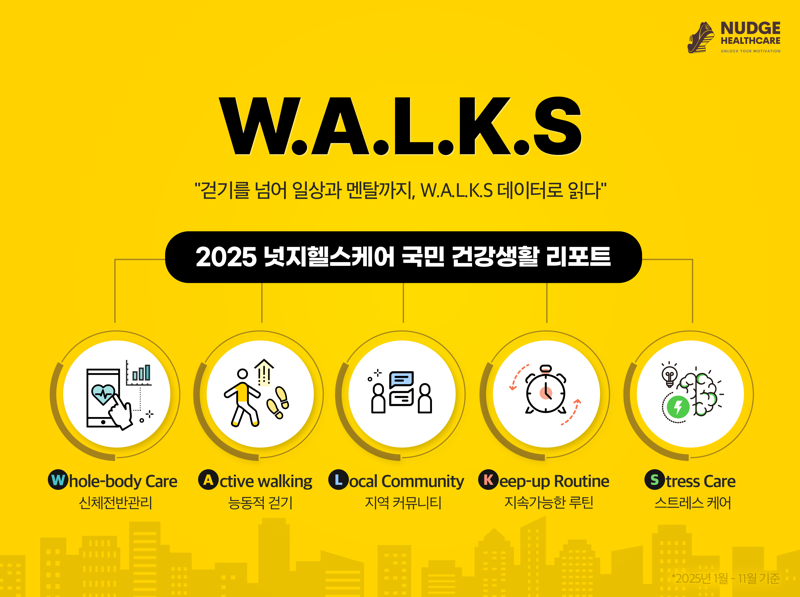 리포트는 캐시워크, 지니어트, 넛지EAP, 트로스트 등 주요 서비스의 실제 유저 행동 데이터를 바탕으로 건강 행동을 'W.A.L.K.S(Whole-body Care, Active Walking, Local Community, Keep-up Routine, Stress Care)'로 정리했다.