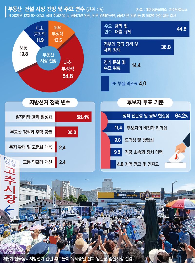 31일 파이낸셜뉴스와 대한상공회의소가 공동으로 실시한 '한국경제 긴급진단 설문조사'에 따르면 2026년 부동산·건설 시장 시장이 '매우 긍정적'이라고 예측한 사람은 단 한명도 없었다. '다소 부정적'에 답을 한 비율이 54.8%로 가장 높았고, '매우 부정적'도 13.5%로 두 항목 합이 전체의 3분의 2를 넘어섰다. '보통'으로 전망한 전문가는 19.8%였다.