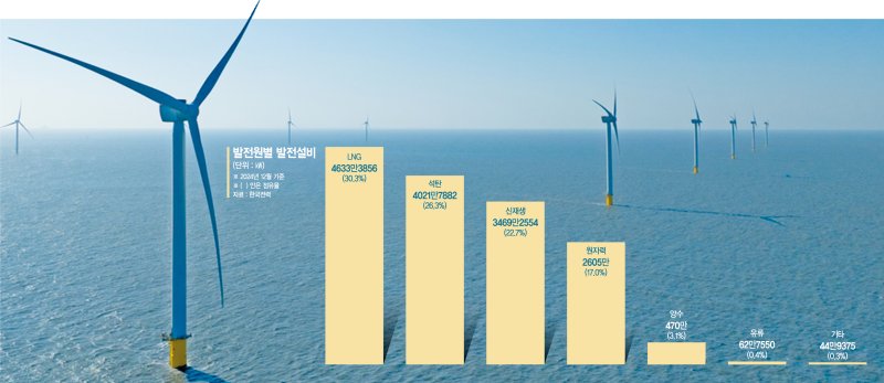 지난해 출범한 이재명 정부의 기후에너지환경부는 원전과 재생에너지 모두 30%대 비중을 목표로 하는 에너지 믹스를 구축하겠다는 방침이다. 2024년 기준 발전원 비중은 원자력 17.0%, 석탄 26.3%, 가스 30.3%, 신재생 22.7%, 유류 0.4%, 양수 3.1%, 기타 0.3%로 정부는 신재생 비중을 대폭 확대해 석탄을 대체한다는 구상이다.