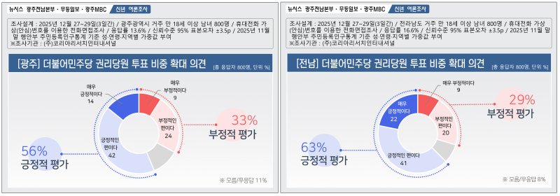 광주지역에서는 민주당의 지방선거 후보 선출 과정에서 권리당원의 투표 비중을 높이는 것에 대해 응답자 중 56%가 긍정적인 평가(긍정적 42%·매우 긍정적 14%)를 보냈다. 뒤를 이어 부정적인 평가가 33%(부정적 24%·매우 부정적 9%), 모름 또는 무응답이 11%로 집계됐다.