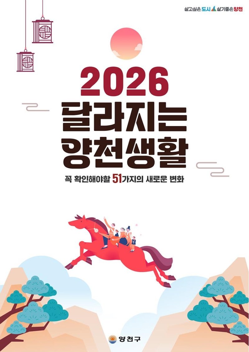 (서울=연합뉴스) 정준영 기자 = 양천구(구청장 이기재)는 2026년 새롭게 시행되거나 확대되는 정책과 제도 51건을 담은 '2026 달라지는 양천생활' 안내서를 2일 구청 홈페이지에 게시했다고 밝혔다.