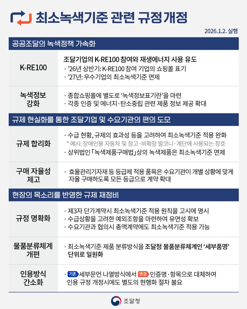 백승보 조달청장은 “이번 최소녹색기준 관련 규정 개편은 현장의 목소리를 반영해 불필요한 행정부담을 완화하고 기업과 수요기관의 편의를 도모하기 위한 조치”라며 “앞으로도 변화하는 환경 정책에 맞게 공공조달도 유연하고 확장적으로 제도를 설계해 나가겠다”고 말했다.