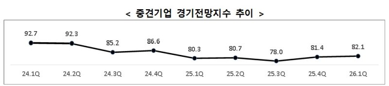 2일 한국중견기업연합회가 발표한 '2026년 1분기 중견기업 경기전망조사'에 따르면 경기전망지수는 직전 분기 대비 0.7p 오른 82.1로 2개 분기 연속 상승했다.