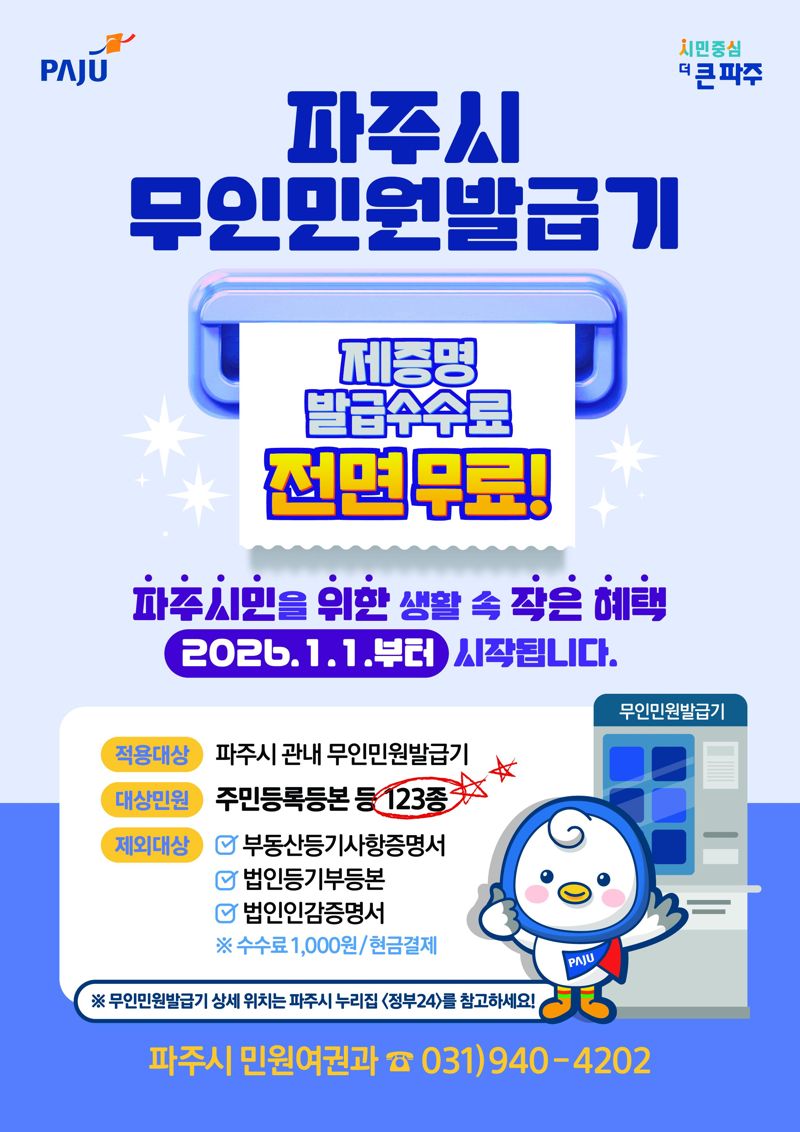 파주시 관계자는 “이번 무인민원발급기 수수료 전면 무료화는 금액으로는 크지 않지만, 시민들이 일상에서 자주 체감할 수 있는 생활 속 작은 혜택”이라며 “시민의 일상을 세심하게 살피며 생활밀착형 행정서비스를 계속 추진해 나가겠다”고 말했다.