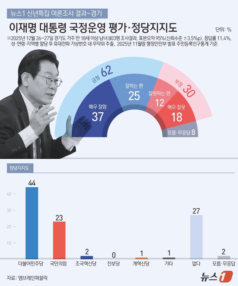 뉴스1 의뢰로 엠브레인퍼블릭이 지난해 12월 26일부터 27일까지 경기도에 거주하는 만 18세 이상 남녀 803명을 대상으로 실시한 이 대통령 국정운영 평가에서 긍정평가는 62%, 부정평가는 30%로 집계됐다.