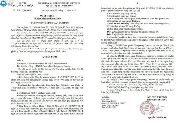 2일 현지 언론 등에 따르면 신풍대우 베트남은 지난달 30일 베트남 보건부 산하 의약품관리국으로부터 이같은 내용의 보건의료 분야 행정 위반에 대해 과태료 처분을 받았다.