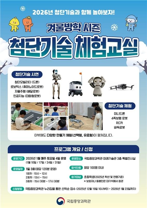 ▲ 국립중앙과학관은 겨울방학을 맞이해 이달 매주 토요일 '겨울방학 시즌 첨단기술 체험교실'을 운영한다고 2일 밝혔다. 체험교실은 드론, 로봇, 자율주행, 인공지능(AI) 등 첨단기술을 초등학생이 직접 조종하며 체험해보는 경험을 제공하기 위해 마련됐다. 매일 3회씩 운영되며 회차당 초등학생 100명을 선착순 모집한다.