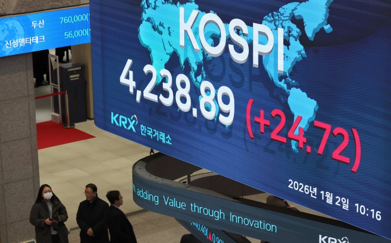 [서울=뉴시스] 김혜진 기자 = 코스피가 전 거래일(4214.17) 보다 10.36p(0.25%) 오른 4224.53에 개장한 12일 오전 서울 영등포구 한국거래소 전광판에 지수가 표시 되고 있다.코스닥 지수는 전 거래일(925.47) 보다 4.88p(0.53%) 오른 930.35에 출발했다.원·달러 환율은 전 거래일 주간거래 종가(1447원)보다 0.5원 오른 1439.5원에 출발했다. 2026.01.02. jini@newsis.com [서울=뉴시스] 류현주 기자 = 새해 첫 거래일인 2일 코스피가 장중 사상 최고치를 기록했다.