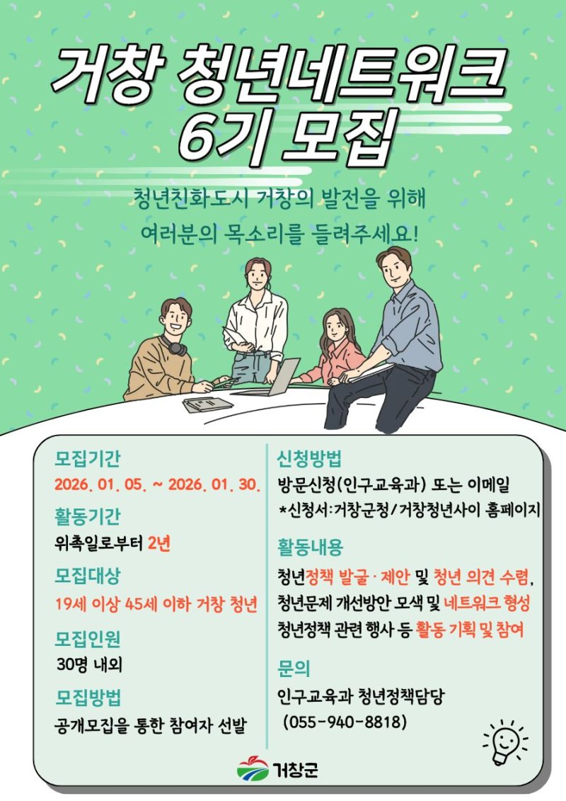 한편 참여를 희망하는 청년은 거창군 누리집 또는 거창청년사이에 게시된 신청서와 구비서류를 작성해 거창군청을 방문하거나 또는 이메일로 접수하면 된다.