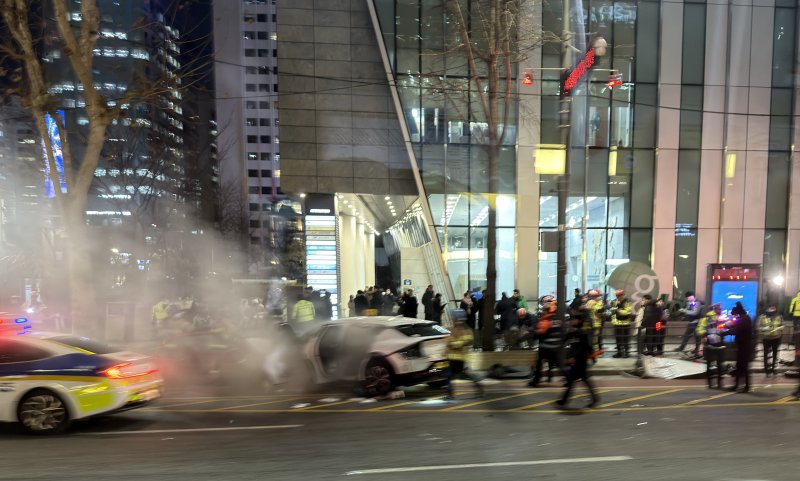 사고 차량은 인도 쪽에 설치된 가로대를 들이받고 차도에 멈춰섰으며 화재가 발생한 것으로 나타났다.