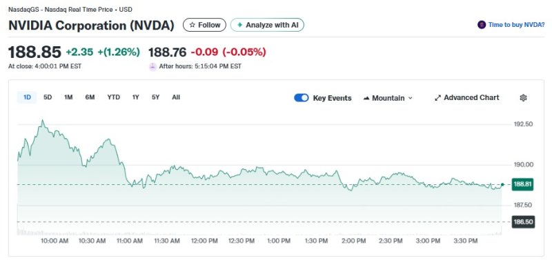 2일(현지 시각) 뉴욕증시에서 엔비디아는 1.26% 상승한 188.85달러를 기록했다. 이로써 시총도 4조5980억달러로 불었다.