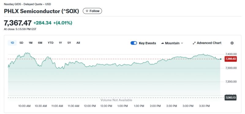 2일(현지 시각) 뉴욕증시에서 반도체지수는 4.01% 급등한 7367.47포인트를 기록했다.