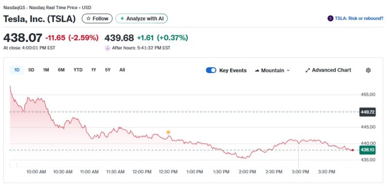 2일(현지 시각) 뉴욕증시에서 테슬라는 2.59% 하락한 438.07달러를 기록했다. 이로써 시총도 1조4570억달러로 줄었다.