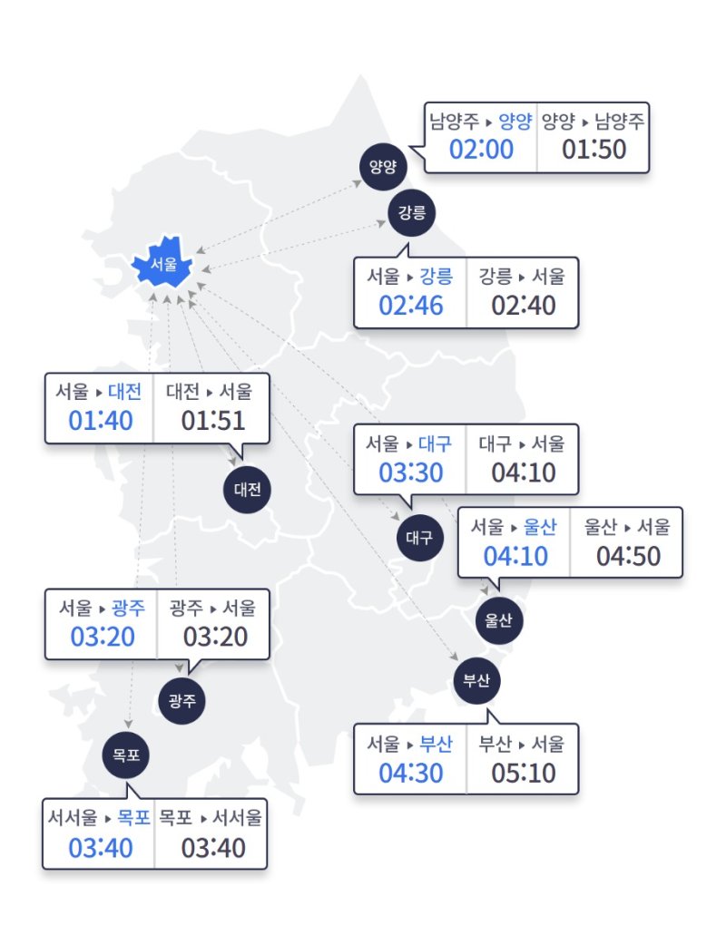 지방 도시에서 서울까지 걸리는 예상 시간은 △부산 5시간 10분 △울산 4시간 50분 △강릉 2시간 40분 △양양 1시간 50분(남양주 도착) △대전 1시간 51분 △광주 3시간 20분 △목포 3시간 40분(서서울 도착) △대구 4시간 10분이다.