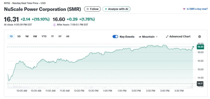 2일(현지 시각) 뉴욕증시에서 월가의 대표 원전주로, 소형모듈원전을 전문적으로 개발하는 SMR은 15.10% 폭등한 16.31달러를 기록했다.