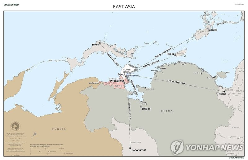 신문은 이 지도에 서울을 기준으로 평양뿐만 아니라 중국 베이징, 대만 타이베이, 필리핀 마닐라까지 거리가 각각 기재됐다면서 "동아시아에서 주한미군의 전략적 우위성을 보여준다"고 해설했다.