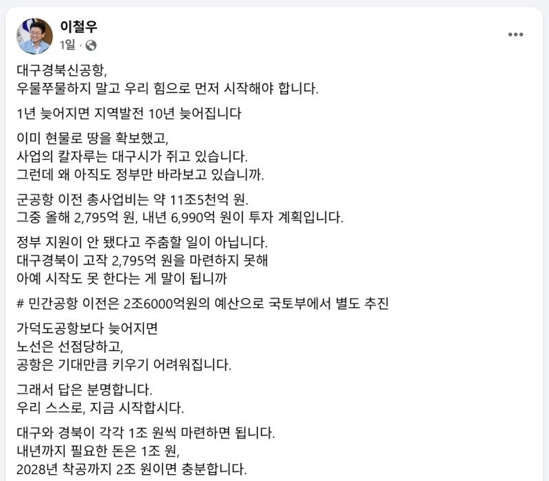 그의 이번 글은 장기간 표류한 대구·경북 신공항 사업을 둘러싸고 대구시에 결단을 촉구하는 공개 메시지로 풀이된다.