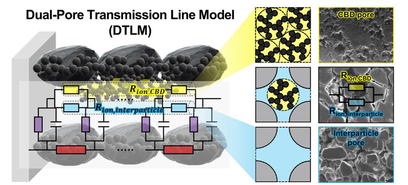 연구팀은 전극 내 기공을 두 종류로 분류하는 분석법을 토대로 이 같은 전극을 개발했다. 전극 안에는 리튬이온이 비교적 잘 통과할 수 있는 큰 기공(입자간 기공)과, 전극 첨가제인 도전재와 바인더가 뭉쳐 형성된 미세 기공(CBD 구조)이 공존하는데, 연구팀은 이 가운데 미세 기공이 리튬이온의 흐름을 방해한다고 봤다. 연구팀은 이를 정량적으로 분석할 수 있는 이중공극 전송선 모델(Dual-Pore Transmission Line Model, DTLM)을 자체 개발해 활용했다. 이 정량 분석을 기반으로, 제조 공정과 도전재 함량 등을 조절해 전극의 내부 구조를 최적화했다.