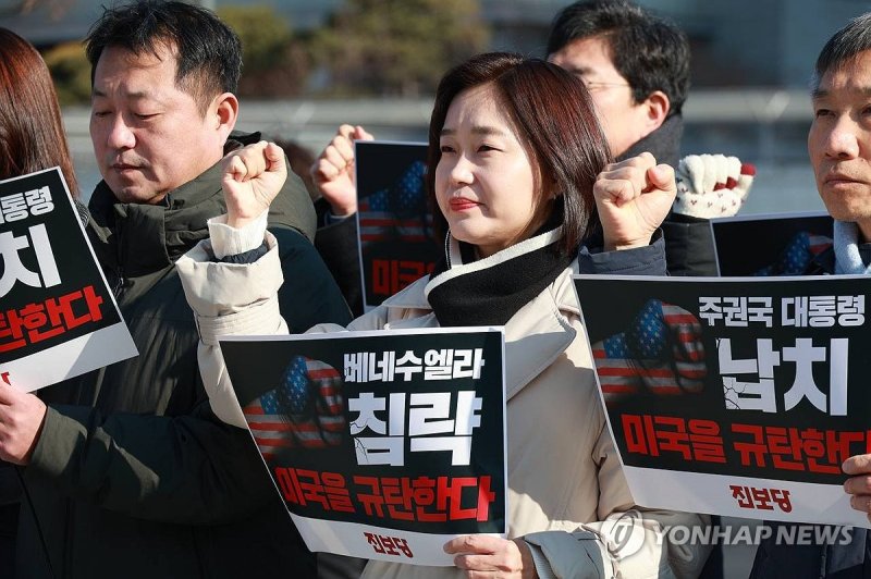 진보당은 이날 서울 광화문 미국 대사관 앞에서 기자회견을 열어 "(도널드 트럼프 미국 대통령은) 유엔 헌장에 명시된 무력 사용 금지, 주권 평등 원칙, 내정불간섭 원칙을 모두 위반했다"며 "명백한 국제법 위반이자 주권 불가침 원칙을 파괴한 심각한 공격행위"라고 주장했다.