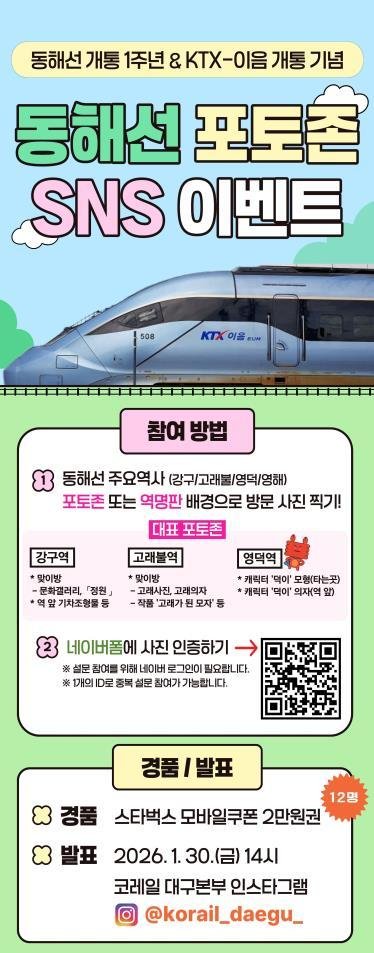 대구본부는 신규 운행을 기념해 오는 27일까지 동해선 주요 역 포토존 인증사진을 제출하면 추첨을 통해 2만 원 상당의 모바일 커피 쿠폰을 제공한다.