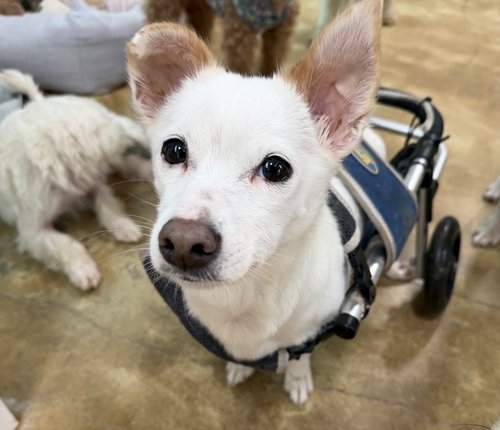 한쪽 구석에 있던 흰색 믹스견 '굳건이'도 움직이지 않는 뒷다리를 이끌고 기자 곁으로 다가와 몸을 비볐다. 유엄빠 박민희 대표는 "사람이 좋으니 만져달라는 뜻"이라고 말했다. 6∼7살로 추정되는 굳건이는 2021년 교통사고로 뒷다리가 마비돼 보행 기기를 쓰지만, 누구보다 사람을 잘 따른다고 했다.