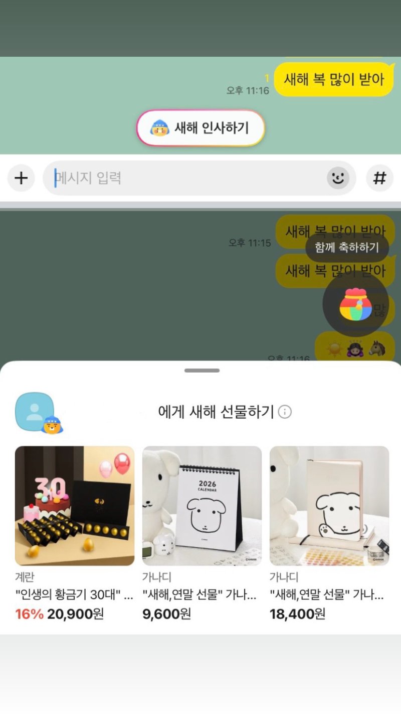 개편 이후부터는 축하 메시지를 보내면 '채팅방에 축하하기' 배너가 뜨고, 클릭하면 미니 웹뷰 형태의 선물하기가 바로 노출된다. 웹뷰 우측 상단에는 폭죽쏘기 배너가 함께 보인다.