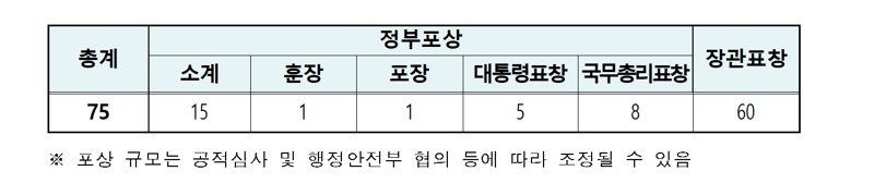 포상 규모는 훈장 1점, 포장 1점, 대통령표창 5점, 국무총리표창 8점 등 정부포상 15점과 성평등가족부 장관표창 60점으로 총 75점이다.