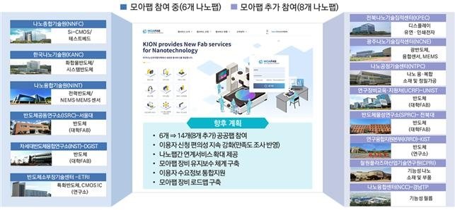 이번 확대에는 ▲ 한국전자기술연구원 전북나노기술집적센터 ▲ 한국생산기술연구원 광주나노기술집적센터 ▲ 대구테크노파크 나노공정기술센터 ▲ 울산과학기술원(UNIST) 연구장비교육·지원처 ▲ 전북대 반도체물성연구소 ▲ 한국과학기술연구원(KIST) 연구융합지원본부 ▲ 철원플라즈마산업기술연구원 ▲ 경남테크노파크 나노융합센터 등이 참여한다.