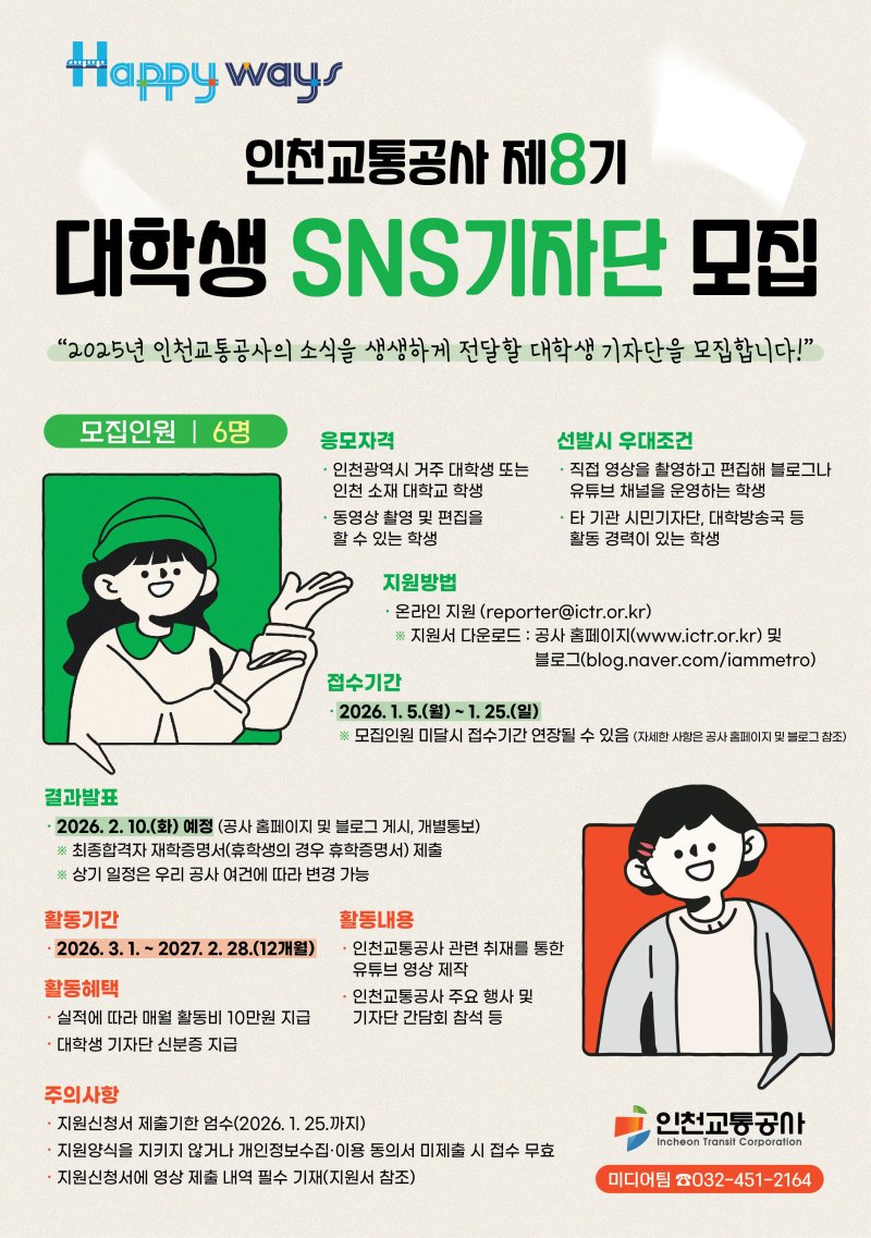 (인천=뉴스1) 이시명 기자 = 인천교통공사는 유튜브 콘텐츠 제작에 참여할 대학생 기자단 6명을 모집한다고 5일 밝혔다.