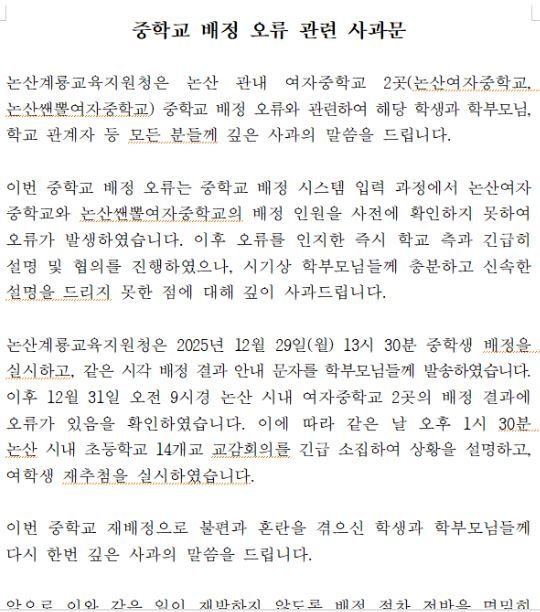 논산계룡교육지원청은 5일 홈페이지에 '중학교 배정 오류 관련'이라는 제목의 사과문을 올렸다.