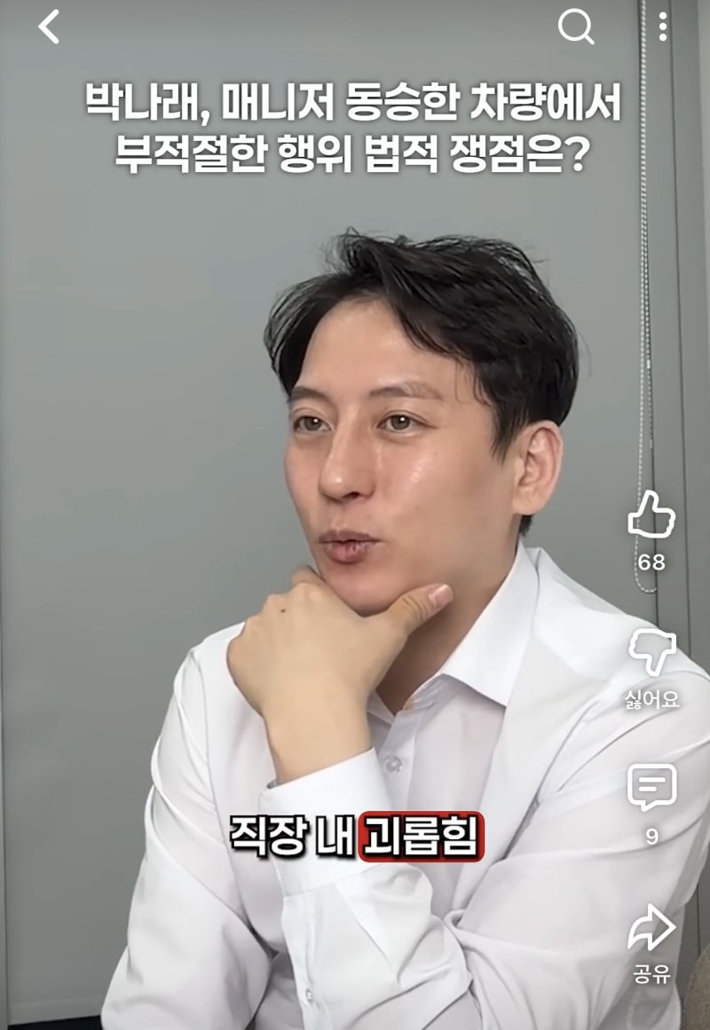 노바법률사무소의 이돈호 대표변호사는 5일 자신의 유튜브 채널에 올린 영상에서 논란이 되고 있는 박나래의 차량 내 행위와 관련, "그런 행위를 했다면 성희롱, 직장 내 괴롭힘 이런 게 문제가 될 것"이라고 말했다.