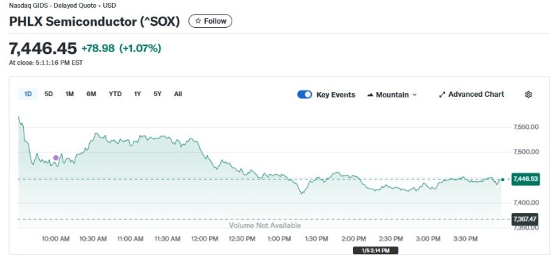 5일(현지 시각) 뉴욕증시에서 반도체지수는 1.07% 상승한 7446.45포인트를 기록했다.