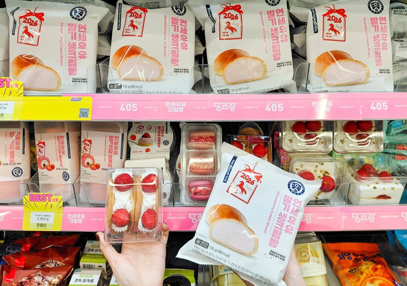 '연세우유 딸기생크림빵' 베스트셀러인 연세우유 생크림빵의 부드러운 빵 안에 달콤한 딸기 생크림을 가득 채웠다.