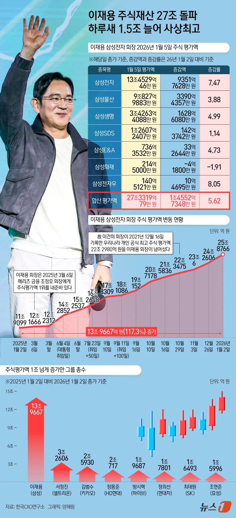 6일 기업분석전문 한국CXO연구소에 따르면 이재용 회장의 5일 기준 주식평가액은 27조 3319억 원으로 집계됐다. 이 회장은 올해 첫 거래일인 2일 기준 주식평가액이 25조 8766억 원을 기록해 선친인 고(故) 이건희 선대회장(22조 2980억 원)을 뛰어넘는 '역대 최고 주식평가액'을 달성했는데, 하루 만에 다시 1조 4553억 원이 증가한 것이다.