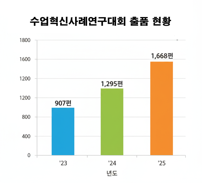 이번 '수업혁신사례연구대회'는 먼저 시도대회(예선)를 거쳤다. 총 1668편이 출품됐으며, 각 교육청의 심사를 통해 846편이 전국대회 출품작으로 선정됐다. 이후 전국대회(본선)에서는 1차 연구 보고서 심사와 2차 수업 동영상 심사를 거쳐 최종 506편이 우수 사례로 뽑혔다.