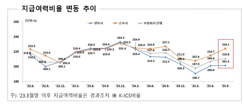 생명보험사가 201.4%으로 집계돼 전분기 보다 0.5%p 늘어났다. 손해보험사는 224.1%를 기록해 전분기 보다 9.5%p 증가했다.