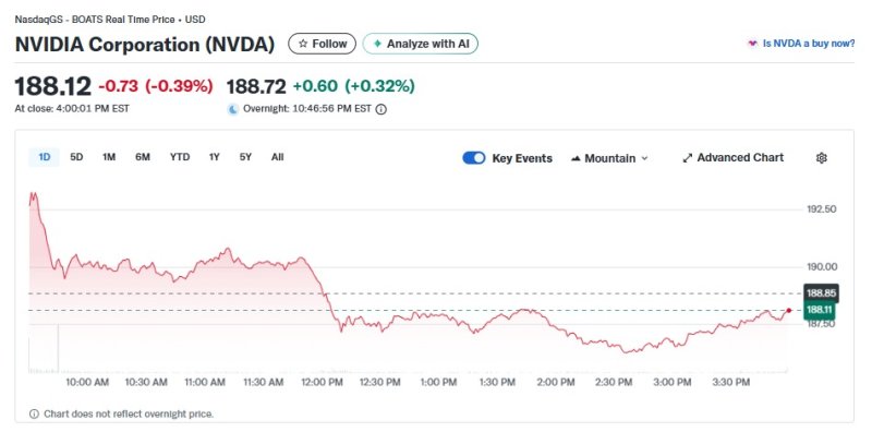 5일 오후 10시 30분 현재(현지 시각) 뉴욕증시 시간외거래에서 엔비디아는 0.32% 상승한 188.72달러를 기록하고 있다. 소폭 상승에 그치고 있는 것. 앞서 정규장은 0.39% 하락, 마감했었다.