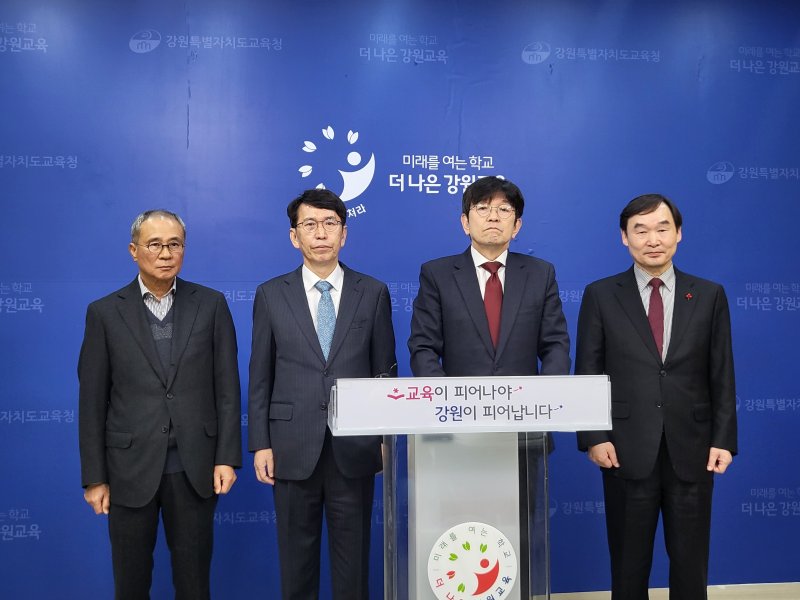 유대균, 조백송, 주국영, 최광익 강원교육감 출마 예정자들은 6일 도교육청 브리핑룸에서 기자회견을 열고 진보 진영의 교육감 후보 단일화 추진기구를 규탄했다.