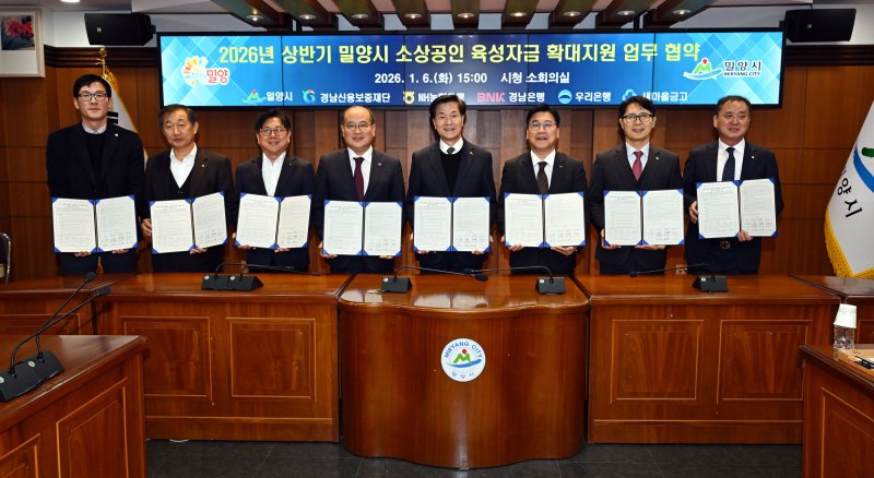 [밀양=뉴시스] 안지율 기자 = 경남 밀양시는 6일 시청에서 경남신용보증재단, NH농협은행, BNK경남은행, 우리은행, 새마을금고와 올해 상반기 소상공인 육성자금 확대 지원을 위한 업무협약을 체결했다.