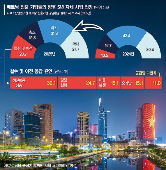 6일 산업연구원(KIET)이 최근 발간한 '베트남 진출기업 경영환경 실태조사 보고서(2025년)'에 따르면 조사 대상 기업 343개 기업 중 "향후 2~3년 내 철수 또는 이전을 고려"하고 있다는 기업 비중이 18.9%에 달해 전년(10.8%) 대비 두 배 가까이 증가한 것으로 나타났다. "향후 5년 내 철수 또는 이전 고려"에 대한 답으로는 무려 20.7%에 달했다.